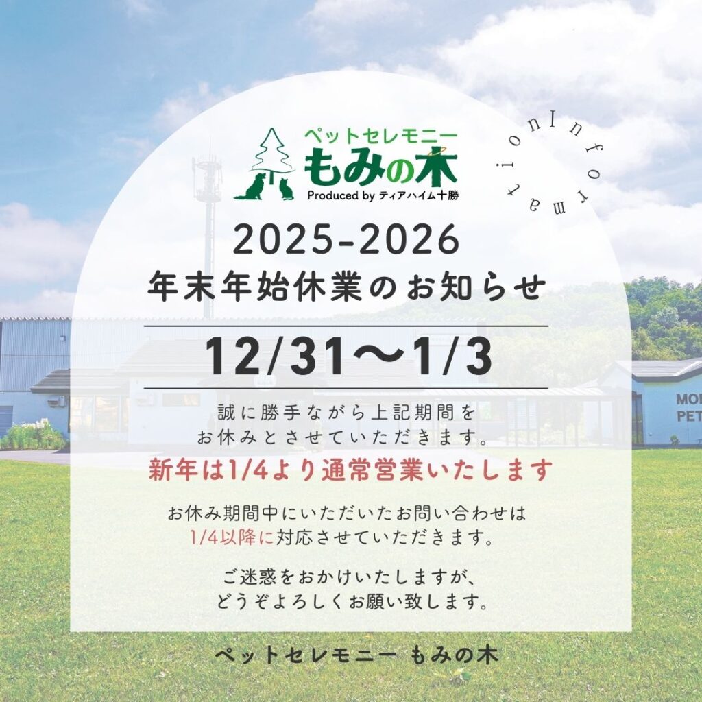 年末年始休業のお知らせ2025年12月25日2025年も大変お世話になり、誠にありがとうございました。ペットセレモニーもみの木の年末年始休業は、下記の通りとなります。●12月31日(水)〜1月3日(土)新年は1月4日(日)より通常営業いたします。お休み期間中にいただいたお問合せは1月4日(日)以降に順次対応させていただきます。何卒よろしくお願い申し上げます。